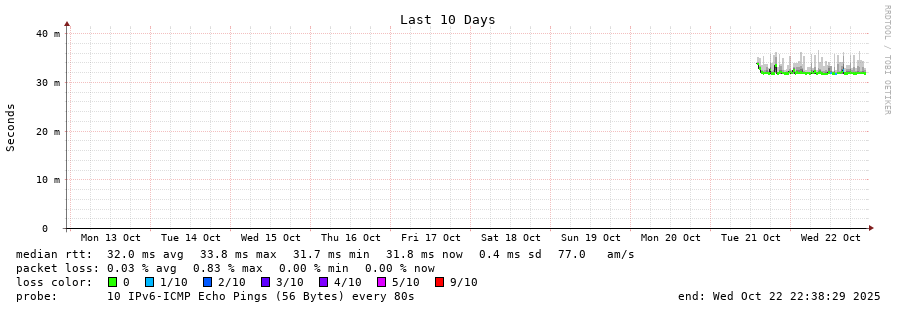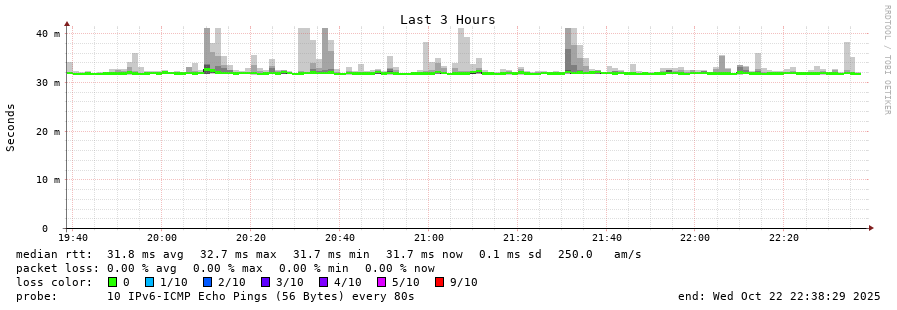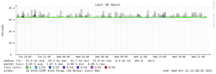traceroute to 2001:67c:1e0:0:c225:e9ff:fea8:6a0a (2001:67c:1e0:0:c225:e9ff:fea8:6a0a), 30 hops max, 80 byte packets - Generated at 2025-10-22 03:30:01