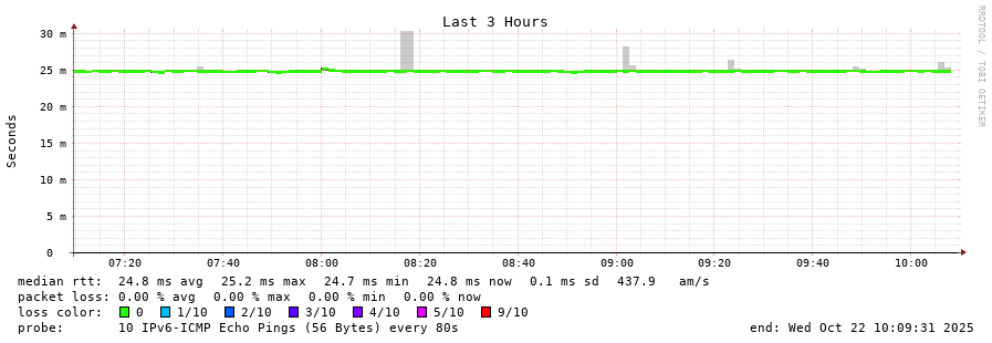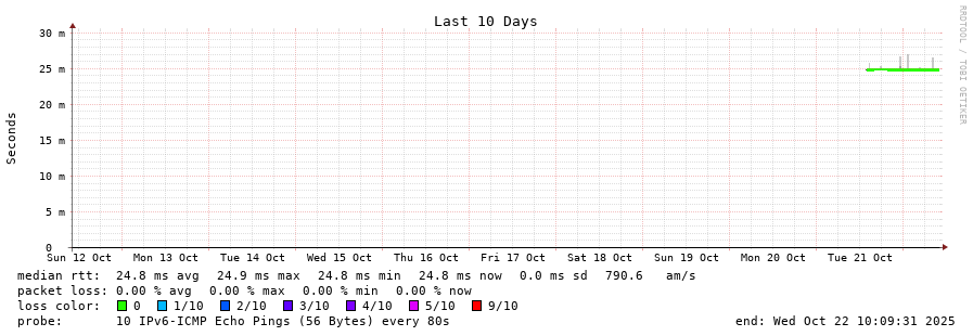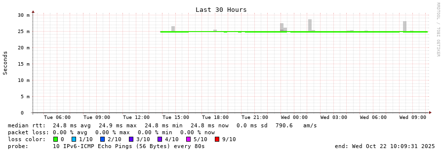 traceroute to 2a00:c30:bbbb:d::2 (2a00:c30:bbbb:d::2), 30 hops max, 80 byte packets - Generated at 2025-10-21 20:30:02